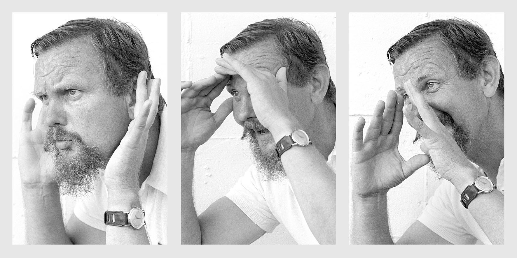 Angeregt durch die Vorschau auf das Düsseldorfer Ausstellungsprogramm 2019, konkret durch das Foto des Künstlers Ai Weiwei, erinnerte ich mich an meine Portraitserie von Tün Schneiderath aus dem Jahre 1979. Tün war damals Tennislehrer in meiner Heimatstadt Wesel, in dem Club, in dem auch ich mich im Tennis übte. Tün war aber nicht mein Trainer. Meine Eltern hätte sein 3/4-Stunden-Honorar finanziell überfordert. Ich trainierte deshalb an der grünen Wand. Oder mit Freunden, wenn mal der vierte Mann zum Doppel fehlte. Was neben mir nicht viele wussten: Tün war neben seinem Brot-und-Butter-Job Dichter und Aphoristiker. Seine nieder geschriebenen Gedanken unter dem Pseudonym „Art van Rheyn“ waren zwar stets wohlüberlegt, aber auch ziemlich geradeaus. Vermutlich war gerade dies der Grund, dass die kurzen, manchmal spitzen, aber nie verletzenden Aussagen, so gut ankamen. Der Dichter bezeichnete sich leicht selbstironisch als „optimistischer Nichtschwimmer, geselliger Menschenfreund und sich nicht ganz ernst nehmender Lebenskünstler”. Meine Begegnungen mit Tün waren keine vielen, aber immer intensive, interessante und lehrreiche.