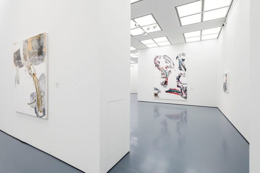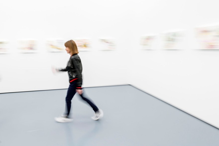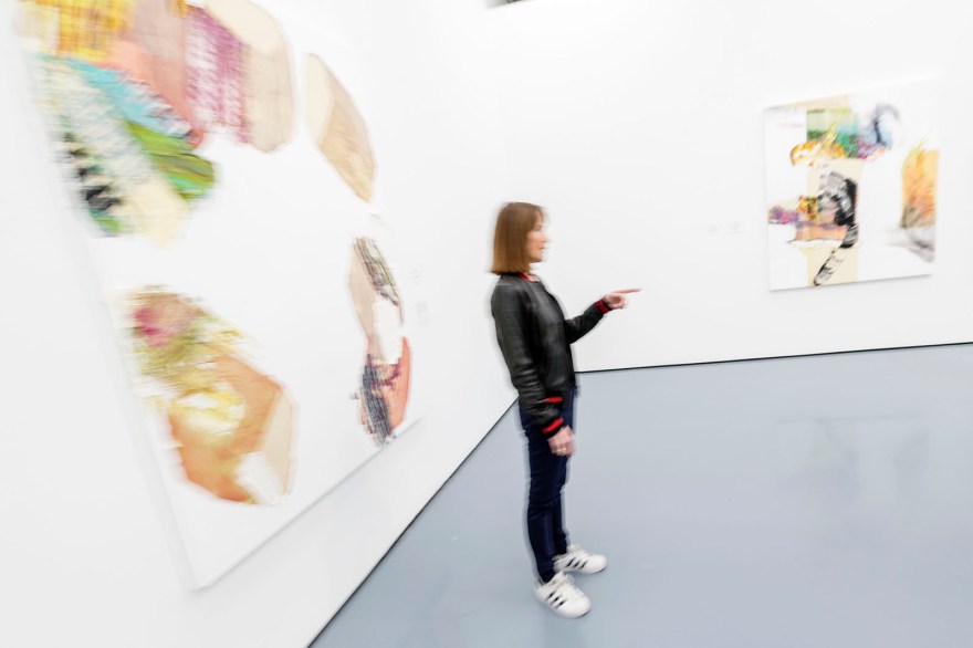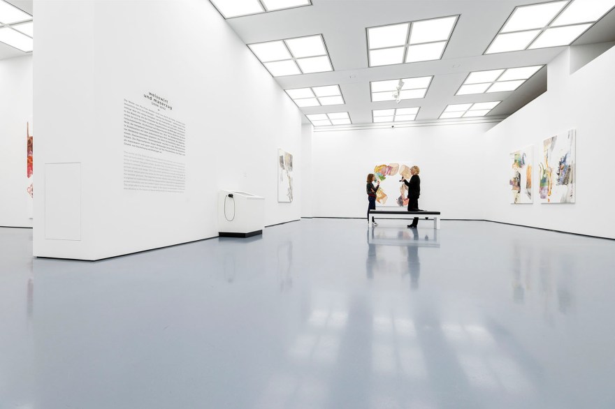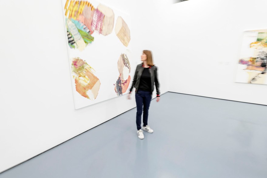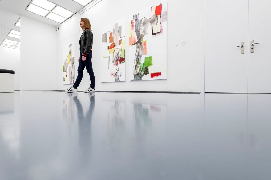 Wie ein Lichtzelt wirkt der neue grell weiße Raum im Erdgeschoss des Kunstpalast, in dem das Museum die Arbeiten von der in Düsseldorf lebenden Künstlerin präsentiert. Im „Raum 1“, wie Generaldirektor Felix Krämer und seine KollegInnen den neuen Ausstellungsraum nennen, waren vor dem Umbau die Kasse und der Museumsshop untergebracht. Die Werke der Künstlerin Pia Fries, die zumeist auf weiß grundierten Tafeln gearbeitet sind, fügen sich fast nahtlos in das Blickfeld der BesucherInnen ein und wirken dadurch trotz extensiver Materialigkeit leicht und bewegt.