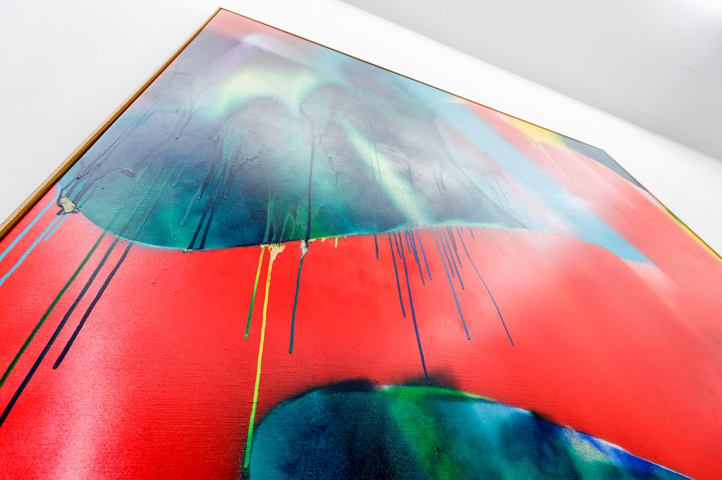 Katharina Grosse malt ihre großformatigen Werke, wie sie sagt, „mit Leichtigkeit“. Ihre Arbeiten korrespondieren mit den kissenartigen „Farbraumkörpern“ von Gotthard Graubner. Graubner deckt die Kraft der Farbe zu und lässt uns denken, was im Innern der Farbkissen explodiert, Grosse deckt die Farben auf und legt sie für uns in großformatigen Installationen aus. Dieser vermeintliche Gegensatz erzielt die Spannung der Werke in der Ausstellung. Der Dialog unter den Arbeiten der beiden Künstler funktioniert aber nur durch visuelles Zuhören der BesucherInnen der großformatigen Ausstellung in Duisburg. Wenn man aber diese Sprache versteht, erfährt man einen Rausch absoluter Farbe.
