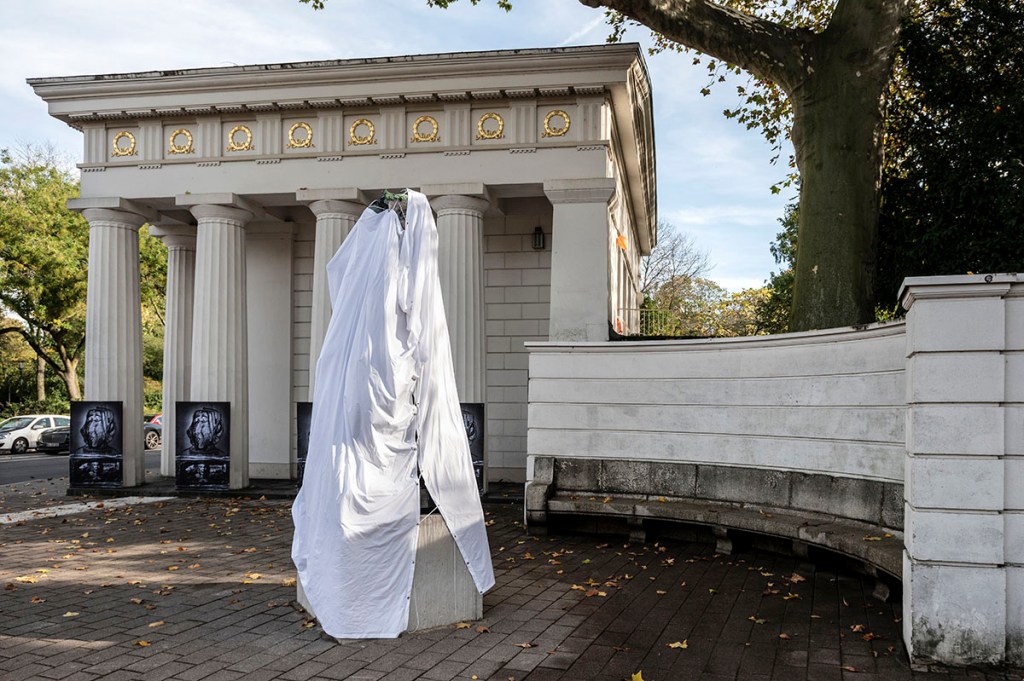 Nach der Ausstellungsvorbesichtigung im K 20 kam ich so gerade noch rechtzeitig am Ratinger Tor vorbei, um die Enthüllung der Schumann-Plastik vom Düsseldorfer Kunst-Enfant-Terrible Markus Lüpertz (*1941 in Reichenberg) erleben zu dürfen. An dieser Stelle veröffentliche ich bewusst das Foto der noch verhüllten Plastik. Da ich auf bewegte Video-Sequenzen auf meinem Blog verzichte, empfehle ich, die Statue, sollten Sie mal in der Nähe vorbeikommen, sich im Original anzusehen, da ihr in jedem Fall eine umfängliche, raumgreifende (360 Grad-) Besichtigung gebührt.