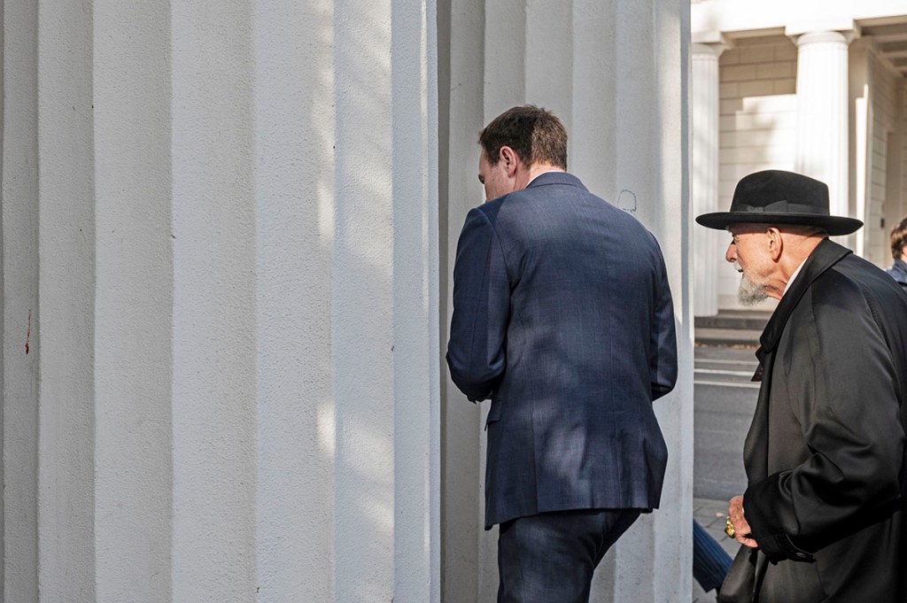 Düsseldorfs Oberbürgermeister Dr. Stephan Keller (*1970 in Aachen, CDU, seit 1. November 2020 im Amt), links und Meister Markus Lüpertz (mit obligatorischem Gehstock und Totenkopf-Ring) auf dem Weg durch eine Hälfte des Ratinger Tors zur gemeinsamen Enthüllung der Statue.