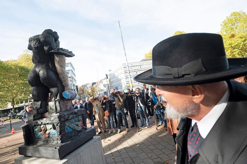 Eine schwere Geburt – so nannte Meister Lüpertz in seiner kurzen Ansprache der feierlichen Enthüllungs-Zeremonie den Prozess, sein Schumann-Denkmal der Stadt Düsseldorf zu stiften. Er sei eigentlich gekommen, um zu schimpfen, sich zu beschweren und zu schelten. Den Sockel, den Transport, ja sogar das Tuch habe er neben allen Fertigungskosten ohnedies auch noch selbst bezahlt. Der wunderbare Standort des Denkmals, das schöne Wetter und die zahlreich erschienen Personen und Persönlichkeiten hätten ihn dann aber besänftigt. So blieb der Grund der „schweren Geburt“, zumindest für die Teilnehmenden der Zeremonie, zunächst im Dunklen. Obendrein lieh der Künstler den gut eineinhalb Dutzend MedienvertreterInnen und den zahlreichen GästInnen dann auch noch ein zufriedenes – durchaus authentisches – Lächeln.