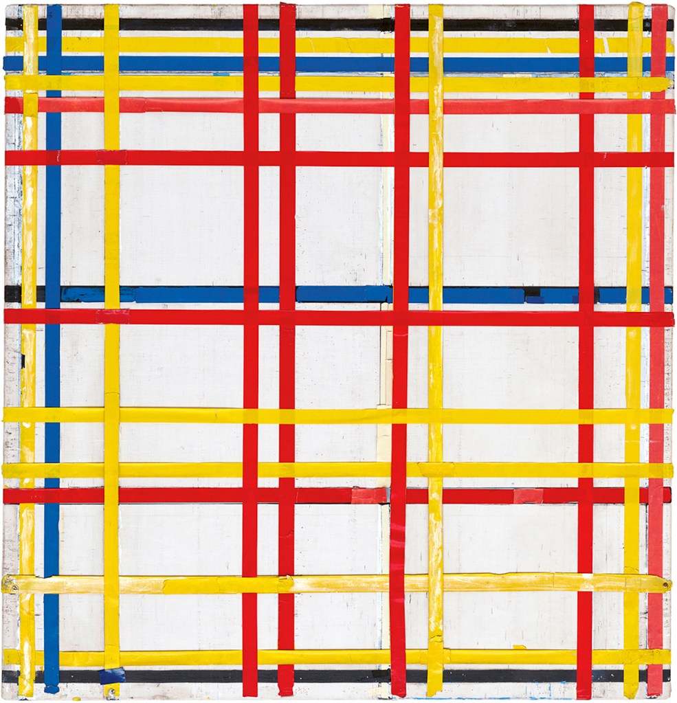 Die Kunsthistorikerin Susanne Meyer-Büser, Co-Kuratorin der Ausstellung im K20 neben Kathrin Beßen, verrät im übrigens empfehlenswerten Katalog, dass das Werk New York City 1 seit über siebzig Jahren auf dem Kopf ausgestellt wird. Geradezu zufällig sei sie auf ein Foto gestoßen, das ein Modefotograf 1944 im Studio Mondrians in New York gemacht hatte, auf dem das Werk auf einer Staffelei im Hintergrund zu sehen ist – um 180 Grad gedreht. Detaillierte restauratorische Untersuchungen der Verlaufsrichtung der Klebestreifen hätten dann ergeben, dass das Werk beim Erstellen auf dem Kopf gestanden haben muss. Mondrian wird durchaus beim langwierigen Entstehungsprozess das Werk mehrfach auf der Staffelei gedreht haben, überzeugen tut mich allerdings ein anderes Indiz für die neue „verkehrte“ Betrachtungsweise: sehe ich auf beide Versionen im direkten Vergleich, fällt mir auf, dass die um 180 Grad gedrehte Variante eine intensivere Tiefe, mehr Räumlichkeit gewährt, die das Bild mehr als einen Stadtplan der geometrisch angelegten Stadt New York aussehen lässt. Das auf den Kopf gedrehte Werk offenbart mir mehr Stadt-Raum als nur Stadt-Plan. Entspräche das nicht mehr der Intention des Autors? Nach Aussage der Kuratorin bleibt das Bild aber zunächst in tradierter Ausrichtung.