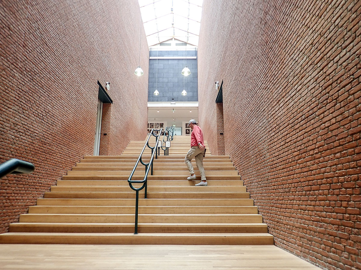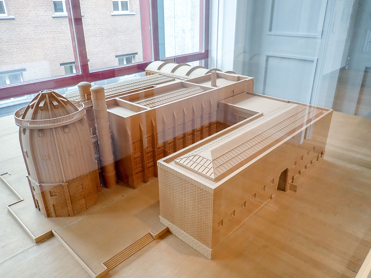 Das Bonnefantenmuseums von Aldo Rossi befindet sich in einem ehemaligen Industriegebiet namens „Ceramique“ und grenzt direkt an die Maas. Von eher traditionellen Profil, bietet das Bonnefantenmuseum eine Reihe von Galerien, die von oben oder von den Seiten beleuchtet werden, organisiert in zwei Flügel um die zentrale Treppe. Der Entwurf basiert auf einem symmetrischen, E-förmigen Grundriss, mit dem markanten Turm in zentraler Lage zum Fluss. Die Arme der E-Form stehen rechtwinklig zum Flussufer, der Mittelarm ist mit dem Turm verbunden. Das Layout des Gebäudes ist im Wesentlichen dreigliedrig, bestehend aus einem Hauptgebäude, dem zylindrischen Turm Volumen mit Kuppel und dem Belvedere. Dieses Belvedere ermöglicht den Besuchern die Aussicht auf die historische Stadt. Der Haupteingang des Museums befindet sich auf der gegenüberliegenden Seite des Gebäudes, und erfolgt über einem Platz an der stark befahrenen Avenue Ceramique. Im Inneren ist die lange zentrale Treppe, bedeckt mit poliertem Hartholz und im Sonnenlicht der verglasten Decke gebadet, das Herzstück. Diese Treppe schafft ein Gefühl einer überdachten Strasse und soll von einem belgischen Beispiel (Montagne de Bueren de Liège) inspiriert sein. Die reiche Kulturgeschichte Europas gilt als entscheidender Impuls für diese Entwurf Aldo Rossi’s. Das Hauptgebäude ist aus traditionellen Materialien wie Stein, Ziegel und Holz gebaut. Die Wände aus schweren Materialien sind durchbrochen, um genügend Tageslicht für die Innenräume zu gewährleisten, was zu einer natürlichen Helligkeit der Galerien führt. Natürliches Tageslicht ist ein Schlüsselfaktor für den Entwurf von Aldo Rossi. Die vordere und seitlichen Fassaden des Museums sind beinahe geschlossen, währenddem die Wände des zentralen Flügels sich grosszügig öffnen. Der markante, zylinderförmige Turm ist in glänzendem Zink verkleidet und kontrastiert mit dem Klinker und dem Stein des geradlinigen Hauptvolumens. Dieser Teil des Entwurfs wurde inspiriert von der schlanken klassizistischen Kuppel der Basilika San Gaudenzio, entworfen vom Turiner Architekten Alessandro Antonelli. Text der InterNet-Seite von © www.archipicture.eu