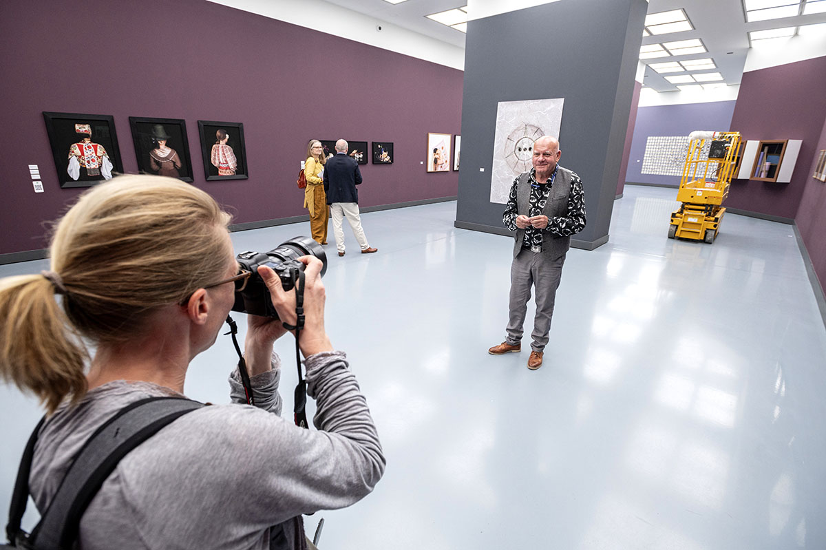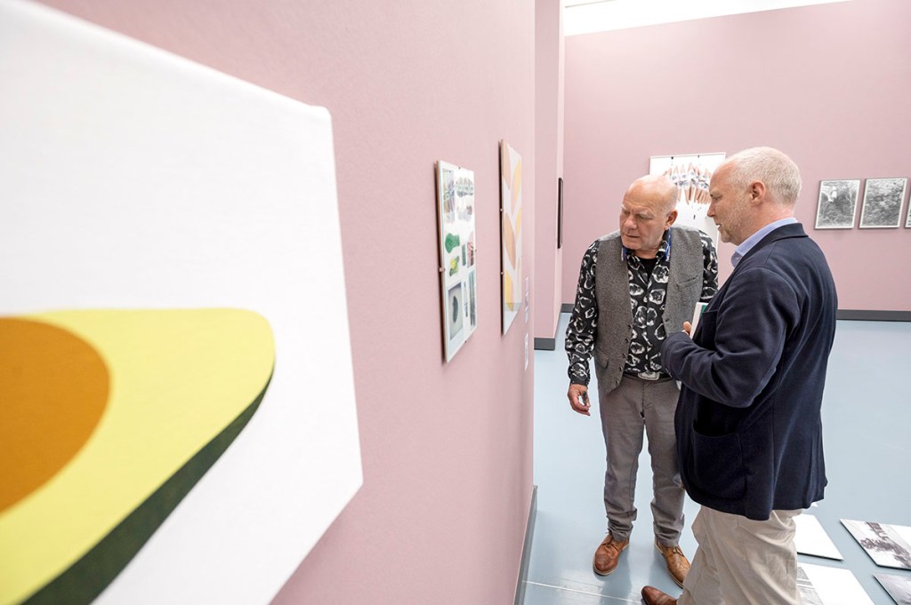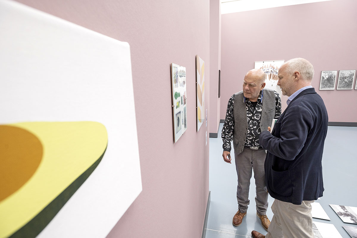 Die Förderpreisträgerin Lara Kaiser und der Kunstpreisträger Jan Kolata vor der Sonderedition „kleinerer“ Kolatas.